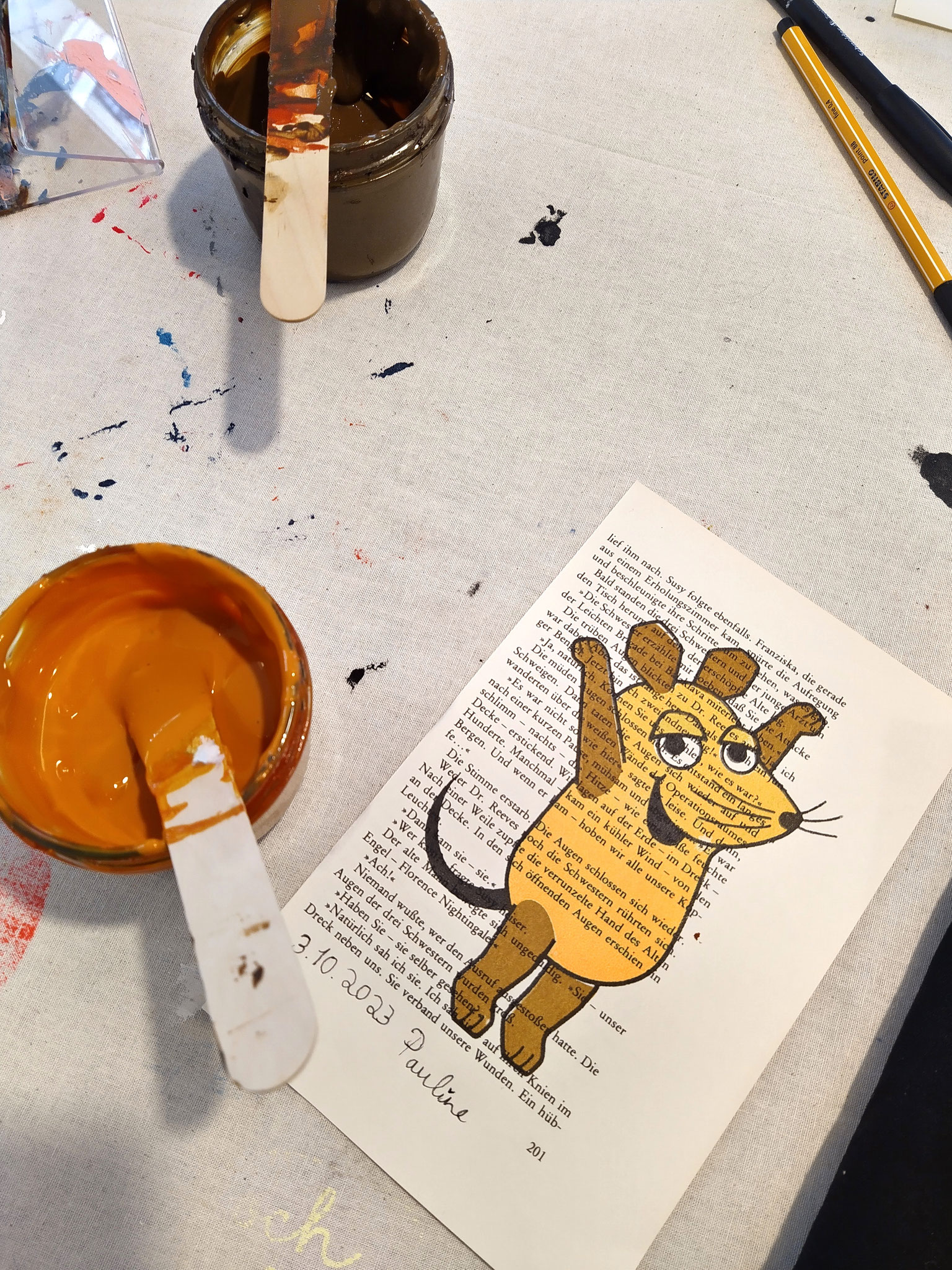 (heller Stoff). Ihr könnt auch z. B. Baumwolltaschen vor Ort zum kleinen Preis erwerben – Papier zum bedrucken stelle ich kostenlos zur Verfügung. Jedes Kind kann EIN Teil bedrucken.